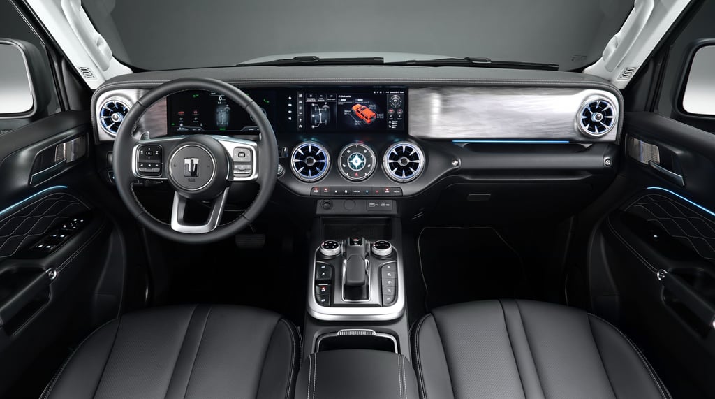 Por dentro, o GWM Tank 300 é um símbolo de sofisticação e conforto, com painéis das portas com costura padrão diamante, acabamento premium em soft touch, com console central climatizado para manter as bebidas frias ou aquecidas, aquecimento do volante de couro, que traz paddle shift integrado, e o som de alta fidelidade, com 9 alto-falantes e 640 W RMS de potência.
