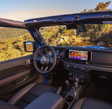 O novo interior fica ainda mais completo com o sistema multimídia touchscreen de 12,3 polegadas - a maior e mais avançada tela disponível no Wrangler – integrada ao premiado sistema Uconnect 5, cercado pelas saídas de ar exteriores que mantêm a sua forma circular caraterística.