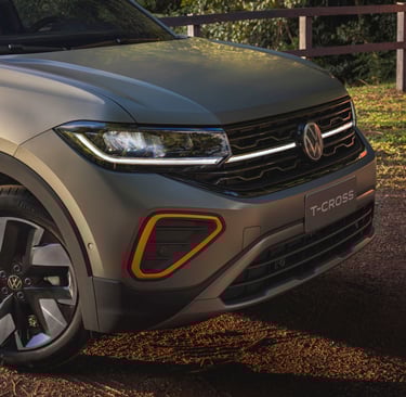 Como novidade para a linha 2026, ambas as versões de topo do T‑Cross, Extreme e Highline, recebem o 'light strip' na grade dianteira conectando os faróis, marca registrada da assinatura de iluminação da VW.